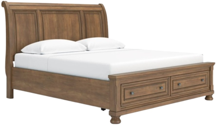 A relaxed take on casual traditional design, this king storage sleigh bed strikes a comfy pose with a classic sensibility. Its timeless design and chestnut brown wood-tone create a welcoming retreat tailored to your laid-back lifestyle. Metal knobs in an aged pewter color subtly dress up footboard drawers packed with storage possibilities.Read More