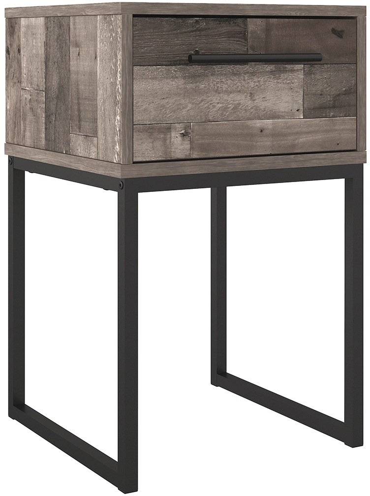 Streamlined design and a stunning finish come together in one simply extraordinary piece. This single drawer nightstand is sure to impress with canted metal legs and a rustic butcher block finish over replicated pine grain texture.Read More