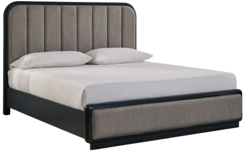 Inspired by art deco design, this softly shaped king upholstered panel bed makes a lasting impression in a simply stunning way. Its magnificent curved silhouette is enhanced by a rich layered black finish on the textured wood grain surface. The channeled vertical headboard and footboard, wrapped in herringbone textured upholstery, merge form and function.Read More