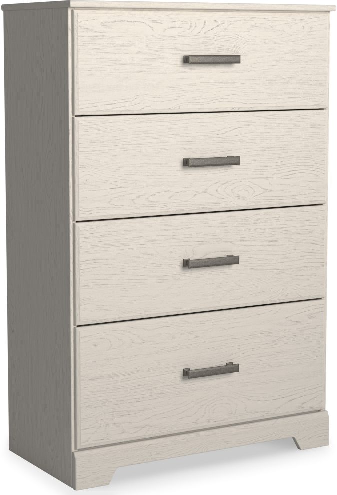 With its clean-lined look and modern attitude, this chest of drawers is a fresh style awakening. A crisp, white hue over subtle replicated wood grain easily complements other furniture finishes. Smooth drawer fronts with antiqued pewter-tone handles complete the aesthetic.Read More