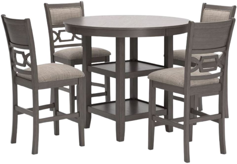 Can’t decide between classic and contemporary? Embrace the beauty of transitional style with this casually sophisticated counter height dining table and bar stools. A clean-lined profile and modern light gray finish merge with textured upholstery to create a timeless yet on-trend look when guests gather. Discreetly placed shelves simply make great storage sense.Read More