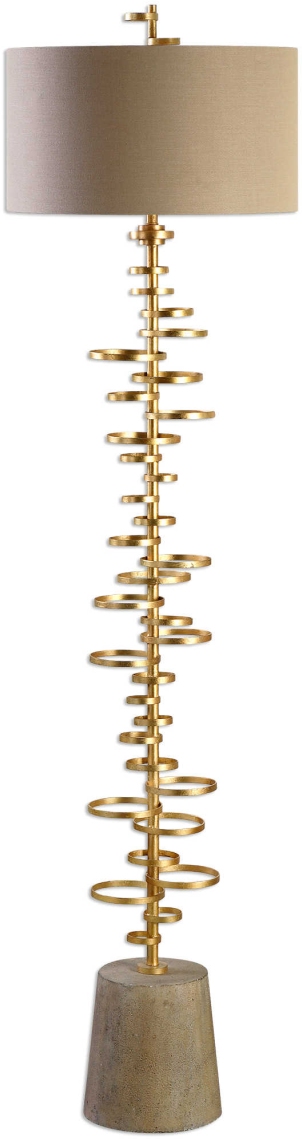 Staggered, multiple sized, thick metal rings finished an antiqued gold leaf accented with a lightly stained concrete foot. The round hardback drum shade is a taupe linen fabric with light slubbing.Read More