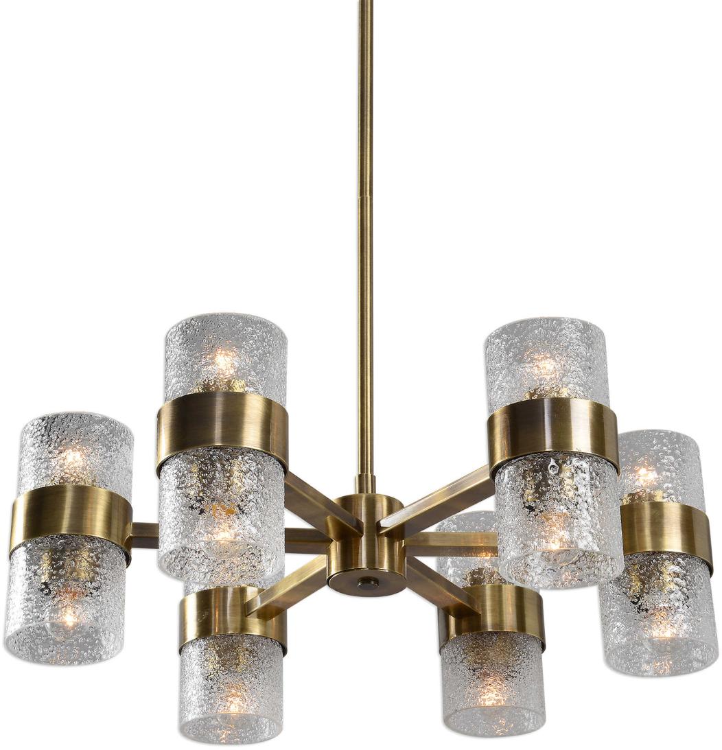 Antique Brass Finish Chandelier Has A Strong Deco Influence In The Design Featuring Thick Textured Clear Glass Cylinder Shades. Includes 12-60w Clear G45 Decorative Bulbs.Read More
