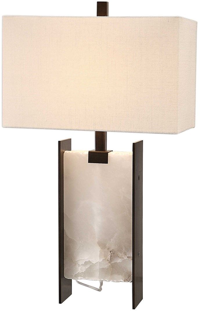 Thick slab of ivory marble with subtle rust veining and hand chiseled edges, suspended between thick steel supports, finished in a distressed dark bronze with gold highlights. The rectangle hardback shade is a white linen fabric.Read More